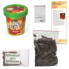 В набор входит: - керамзит; - крышка-поддон; - пластиковый горшок (0,5 л); - плодородный грунт (PH=6-7); - семена.