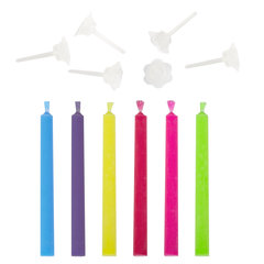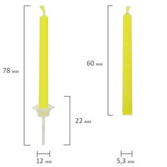Высота свечи – 6 см, толщина – 0,5 см. Тип свечи: для торта "цветное пламя", Количество в комплекте: 6 шт., Длина: 60 мм, Особенности: цветное пламя, Форма: цилиндр, Наличие держателя: да, Материал: парафин, Цвет: ассорти, Упаковка: картонная коробка с европодвесом. Код: 591459