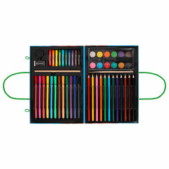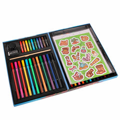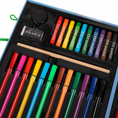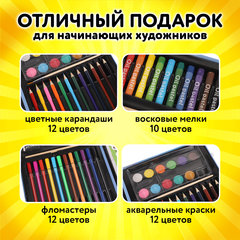 В набор входят: высококачественные цветные карандаши – 12 цветов; яркие восковые мелки – 10 цветов; удобные шестигранные фломастеры – 12 цветов; насыщенные акварельные краски – 12 цветов; чернографитный карандаш – 1 штука; кисть из синтетики – 1 штука; палитра – 1 штука; раскраски – 5 листов; ластик – 1 штука; наклейки – 17 штук; точилка – 1 штука; раскладывающийся кейс с красочным дизайном и пластиковыми подложками. Назначение: для рисования и творчества, Количество в комплекте предметов: 75 шт., Цвет кейса: светло-голубой, Упаковка: короб из гофрокартона. Код: 665674