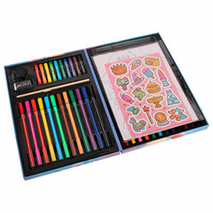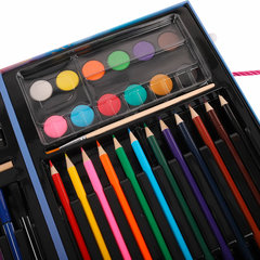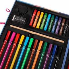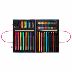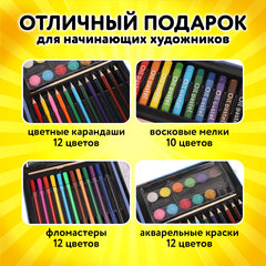 В набор входят: высококачественные цветные карандаши – 12 цветов; яркие восковые мелки – 10 цветов; удобные шестигранные фломастеры – 12 цветов; насыщенные акварельные краски – 12 цветов; чернографитный карандаш – 1 штука; кисть из синтетики – 1 штука; палитра – 1 штука; раскраски – 5 листов; ластик – 1 штука; наклейки – 17 штук; точилка – 1 штука; раскладывающийся кейс с красочным дизайном и пластиковыми подложками. Назначение: для рисования и творчества, Количество в комплекте предметов: 75 шт., Цвет кейса: небесно-голубой, Упаковка: короб из гофрокартона. Код: 665673