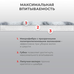 В сухом виде в процессе уборки поверхность насадки электризуется и притягивает к себе мельчайшие частицы пыли. Губка между верхним и нижним слоями надежно впитывает и удерживает влагу, забирая в структуру ткани любые загрязнения, и не оставляет разводов. Внешний слой с прозрачными полипропиленовыми волокнами очищает поверхность от мелкого мусора и пыли. PP волокна эффективны при уборке волос и шерсти.