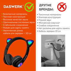 Беспроводные наушники DASWERK с кошачьими ушками и подсветкой - это яркая и надёжная гарнитура. Слушай музыку, аудиокниги, играй!Беспроводные наушники стилизованы кошачьими ушками и лапками. Также наушники имеют светодиодную подсветку внутри, которая ярко переливается, создает праздничное настроение и является привлекательным отличием от других моделей. Подсветку можно отключить и продолжить пользоваться наушниками.