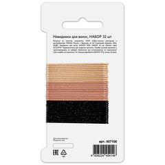 Тип товара: невидимки для волос, Цвет: ассорти, Тип покрытия: глянцевый, Тип заколки: невидимка, Декор: нет, Набор: да, Количество в наборе: 32 шт., Размер: 5 см, Материал: металл, Серия: -, Упаковка: картонная карточка с европодвесом.