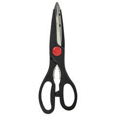 Ножницы отлично подойдут для разделки рыбы и мяса птицы, нарезки овощей, зелени и пиццы. Будут эффективны при резке проводов и кабелей, а также справятся с подрезкой комнатных и садовых растений. Тип : классический, Длина: 210 мм, Количество функций: 2 шт., Функционал: орехокол, Материал ручек: пластик, Цвет ручек: черный, Материал лезвия: сталь, Длина лезвий: 84 мм, Серия: Kitchen, Упаковка: блистер с европодвесом. Код: 608905