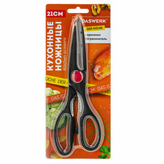 Кухонные ножницы DASWERK сочетают в себе максимальную функциональность и прочность. Конструкция модели позволяет справиться с различными задачами на кухне и в быту.Прочные лезвия толщиной 2 мм из нержавеющей пищевой стали соединены усиленной осью, что исключает зазор и люфт, обеспечивая точность реза. Изделие снабжено эргономичными пластиковыми ручками с противоскользящим покрытием, обеспечивающими надежный захват инструмента при работе и препятствующими выскальзыванию его из рук. Ножницы легко моются, не впитывают посторонние запахи. Их можно мыть в посудомоечной машине. Общая длина – 210 мм. Оснащены механизмом для колки орехов, ограничителем для безопасного использования.