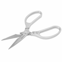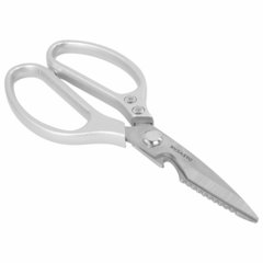 Кухонные ножницы DASWERK сочетают в себе максимальную функциональность и прочность. Конструкция модели позволяет справиться с различными задачами на кухне и в быту.Прочные лезвия толщиной 4 мм из нержавеющей пищевой стали, соединены усиленной осью, что исключает зазор и люфт, обеспечивая точность реза. Изделие снабжено эргономичными металлическими ручками с противоскользящим покрытием, обеспечивающими надежный захват инструмента при работе и препятствующими выскальзыванию его из рук. Легко моется, не впитывает посторонние запахи, можно мыть в посудомоечной машине. Общая длина – 210 мм. Ножницы оснащены открывашкой для бутылок и зазубренным ребром для чистки рыбы.