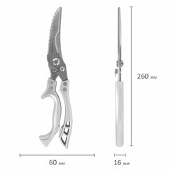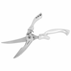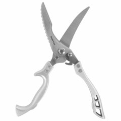 Ножницы отлично подойдут для разделки и чистки рыбы, мяса птицы, нарезки овощей и зелени. Будут эффективны при резке проводов и кабелей, а также справятся с подрезкой комнатных и садовых растений. Тип : ножницы-секатор, Длина: 260 мм, Количество функций: 2 шт., Функционал: зазубренные лезвия, Материал ручек: алюминий, Цвет ручек: серебристый, Материал лезвия: сталь, Длина лезвий: 140 мм, Серия: Kitchen, Упаковка: блистер с европодвесом. Код: 608902
