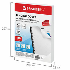 Обложки для переплета BRAUBERG придадут документам эстетичный внешний вид и защитят от повреждений. Предназначены для переплета документов брошюровщиком с помощью пластиковых и металлических пружин. Актуальны для создания деловых брошюр.Выполнены из прочного, износостойкого картона белого цвета плотностью 230 г/м2. Тиснение под кожу. Подходят для документов формата А4. 100 штук в комплекте.