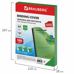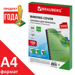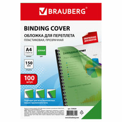 Обложки пластиковые для переплета, А4, КОМПЛЕКТ 100 шт., 150 мкм, прозрачно-зеленые, BRAUBERG, 530828