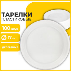 Одноразовые тарелки десертные, КОМПЛЕКТ 100 шт., пластик, d=170 мм, БЮДЖЕТ, белые, ПС, холодное/горячее, LAIMA, 600942