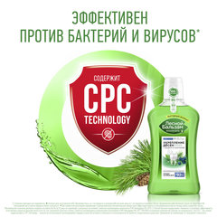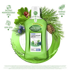 Формула ополаскивателя усилена хвойными смолами и экстрактами можжевеловых ягод и коры дубы, не содержит парабенов, SLS и спирта и рекомендован стоматологами для ежедневного использования: • Хвойные смолы оказывают на десны противовоспалительный эффект; • Экстракт коры дуба снимает воспаление и улучшает состояние полости рта; • Экстракт можжевеловых ягод обладает антибактериальными свойствами.