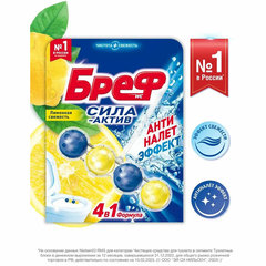 БРЕФ "Сила-Актив 4 в 1" – твердый туалетный блок нового поколения, который представлен в форме ярких разноцветных шариков. Формула 4 в 1 обеспечивает: гигиеническую чистоту, суперпену, защиту от известкового налета и устойчивый аромат лимонной свежести.Чистящее средство для унитаза Бреф "Сила-Актив" +50% АНТИНАЛЕТ ЭФФЕКТ* – подвесной туалетный блок с усиленной формулой против известкового налета. Современная формула шариков для унитаза Бреф "Сила-Актив" содержит поверхностно-активные вещества и неорганические соли, которые обеспечивают гигиеническую чистоту унитаза и защиту от бактерий.