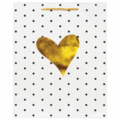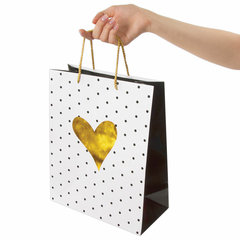 Изготовлен из ламинированной мелованной бумаги с веревочными ручками из полипропилена. Размер – 26x13x32 см. Пакет выполнен в белом цвете с принтом "черный горошек" и изображением сердца золотистого цвета. Формат: вертикальный, Вид пакета: штучный, Дизайн: золотое сердце, Материал: мелованная бумага, Количество в комплекте: 1 шт., С рисунком: да, Цвет: черно-белый, Размер пакета: L (26х13х32) см, Формат размера пакета: L. Код: 606583