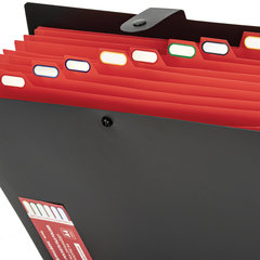 Имеет 12 отделений с ярлыками на разделителях и неоновыми стикерами (в комплекте), что существенно упрощает процесс поиска нужного документа и позволяет структурировать информацию. Удобный и надежный замок-кнопка дает возможность быстро открывать и закрывать папку, не позволяя содержимому выпасть, и защищает его от влаги, пыли и механических повреждений.