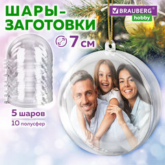 Пластиковые шары для поделок BRAUBERG HOBBY предназначены для создания уникальных новогодних украшений, красочных поделок и аксессуаров для дома.Пластиковые шары для поделок BRAUBERG HOBBY предназначены для взрослых, увлекающихся творчеством, и детей старше 3 лет. В набор входят 10 половинок (полусфер) из прозрачного пластика диаметром 7 см. Они имеют удобную конструкцию с "ушками", которые необходимо соединить, чтобы получилась петля для подвешивания. Таким образом из 10 половинок образуются 5 прозрачных пластиковых шаров, являющихся замечательными заготовками как для новогоднего творчества, так и для интерьерных украшений – гирлянд, фотоподелок, мобиля.