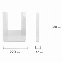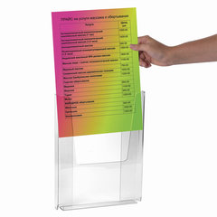 Тип товара: подставка, Формат листовки: А4, Расположение: вертикальное, Функциональность: односторонний, Количество отделений: 1, Размещение: настенное, Прозрачная: да, Материал: ПЭТ, Высота вставляемого листа: 290 мм, Ширина вставляемого листа: 215 мм, Высота: 280 мм, Ширина: 215 мм, Глубина: 32 мм.