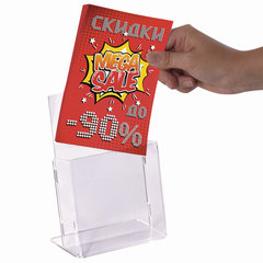 Вертикальная настольная подставка STAFF с высоким бортом. Вмещает по несколько листовок и буклетов одновременно. Подходит для рекламных материалов формата 1/3 А4.Изготовлена из прозрачного акрилового стекла. Предназначена для настольного размещения. Упакована в полиэтилен.