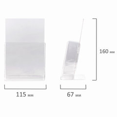 Тип товара: подставка, Формат листовки: нестандартный, Расположение: вертикальное, Функциональность: односторонний, Количество отделений: 1, Размещение: настольное, Серия: Profit, Прозрачная: да, Материал: акриловое стекло, Высота вставляемого листа: 170 мм, Ширина вставляемого листа: 105 мм, Высота: 160 мм, Ширина: 115 мм, Глубина: 32 мм.