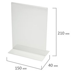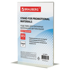 Двусторонняя вертикальная настольная подставка BRAUBERG подходит для размещения меню, рекламных материалов формата А5.Изготовлена из прозрачного акрилового стекла. Предназначена для настольного размещения. Формат А5 и меньше. Максимальная высота вставляемого листа - 210 мм, максимальная ширина вставляемого листа - 150 мм.