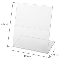 Настольная подставка BRAUBERG для размещения бумажных ценников и рекламной информации.Устойчивая практичная конструкция изготовлена из прозрачного акрилового стекла толщиной 1 мм. Имеет размер 150х105 мм. Максимальная толщина вставки составляет 1,5 мм, глубина основания держателя информации - 75 мм, ширина ножки - 1 мм. Идеально подходит для формата А6.