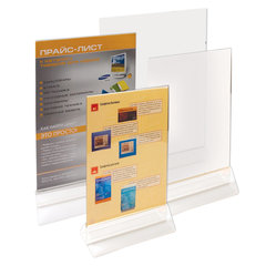 Двухсторонняя настольная подставка для листов формата А4. Изготовлена из идеально прозрачного акрилового стекла. Подойдет для размещения меню, рекламных материалов.