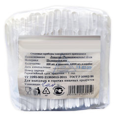 Тип товара: размешиватель, Назначение: для холодного и горячего, Длина: 130 мм, Соответствует требованиям ГОСТа: ГОСТ Р 50962-96, Материал: полипропилен, Количество в упаковке: 500 шт., Цвет: белый, Компакт-упаковка: да.