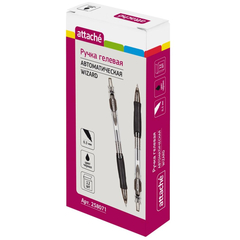 Ручка гелевая автоматическая Attache Wizard изготовлена из качественного пластика. Ручка обеспечивает легкое и мягкое письмо. Чернила быстро высыхают, не размазываются. Эргономичная резиновая манжетка снижает напряжение руки во время работы. Ручка имеет круглый корпус прозрачного цвета. Детали ручки черного цвета соответствуют цвету чернил. Сменный стержень длиной 110 мм. Диаметр пишущего узла, равный 1 мм, создает линию письма, равную 0,5 мм. Цвет чернил: черный. Имеет стандартный наконечник. Особый акцент этой ручке придает лаконичный дизайн. Товар относится к ценовому сегменту "суперэконом". Имеет упрощенные характеристики и более простую упаковку. Отвечает основным требованиям потребления.