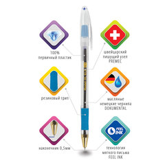 ЭКСКЛЮЗИВНАЯ СЕРИЯ шариковых масляных ручек BRAUBERG "Model-XL GLD"! Уникальный дизайн и непревзойдённое качество!Модель изготовлена из высококачественных материалов, сменный стержень длиной 140 мм снабжен швейцарским стандартным наконечником фирмы PREMEC и заправлен немецкими чернилами на масляной основе DOKUMENTAL синего цвета. Удобная прорезиненная зона захвата. Специальная технология "FEEL INK" гарантирует легкое и четкое письмо без каких-либо усилий. Диаметр пишущего узла 0,5 мм создает тонкую линию письма, равную 0,25 мм. Благодаря грипу удобство использования ручки возрастает в десятки раз. Прозрачный цвет корпуса с синими деталями соответствует классическому офисному стилю.