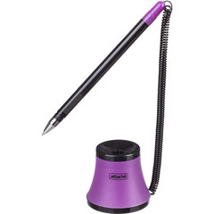Шариковая ручка на подставке Attache Unity. Удобна для использования в офисах и различных учреждениях. С одной стороны ручка крепится к пластиковой пружине, а с другой - к специальной подставке с липким основанием для установки на столах или тумбах. Модель выполнена в стильном черном корпусе, который гармонирует с яркими деталями подставки. Рифленая поверхность зоны захвата предотвращает скольжение пальцев при письме. Толщина линии письма - 0,5 мм. Цвет чернил - синий. Возможна замена стержня. Форма корпуса - круглая, Масляная - Да, Крепление к поверхности - на липучке, Наличие резиновой манжетки - Нет, Цвет корпуса - фиолетовый/черный, Тип механизма - отсутствует, Тип упаковки - картонная коробка, Диаметр шарика, мм - 0.7, Возможность смены стержня - да, Страна происхождения - Китай, Длина стержня - 135 ММ, Материал корпуса - пластик, Цвет чернил - синий, Толщина линии письма, мм - 0.5, Форма наконечника - стандартная, Крепление к подставке - пружина, Кол-во штук в единице продажи - 1