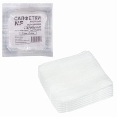 Стерильные марлевые салфетки изготовлены из отбеленной хлопчатобумажной медицинской марли плотностью 32 г/м2 путем сложения в 8 слоев. Салфетки сложены индивидуально и упакованы по 10 штук.Медицинские марлевые салфетки применяются для использования в качестве готовых операционно-перевязочных средств, для наложения повязок, осушения ран, при перевязках и операциях, для тампонады с целью остановки кровотечения и дренирования, закрепления перевязочного материала, давления на какую-нибудь часть тела (в основном, для остановки кровотечения), предупреждения отека тканей, а также для защиты раны или измененной поверхности кожи от воздействия внешней среды.