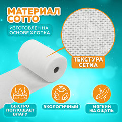 Белые нестерильные одноразовые салфетки поставляются в рулоне, состоящем из 100 листов размером 20х30 см.Салфетки изготовлены из нового материала Cotto на основе хлопка. Производятся из нетканого материала плотностью 45 г/м2. Ткань обладает сетчатой структурой, обеспечивает максимально быстрое поглощение влаги. Служит для ухода за лицом и областью декольте, а также для маникюра.
