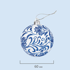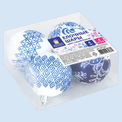 Покрытие шаров - матовое. Количество в наборе: 4 шт., Диаметр: 6 см, Материал: пластик с рисунком, Цвет: белый/синий, Отделка: матовое покрытие/глиттер, Наличие рисунка: да, Серия: Гжель. Код: 591130