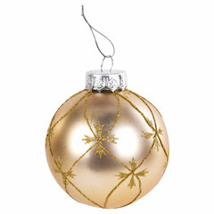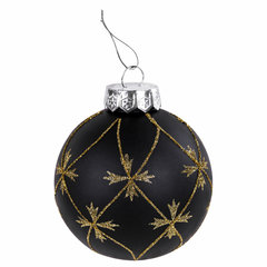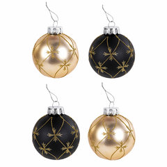 2 матовых шара золотистого цвета с рисунком, 2 матовых шара чёрного цвета с рисунком, а также 4 нити из полиэстера золотистого цвета длиной 30 см для подвешивания шаров.