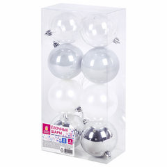 2 прозрачных шара серебристого цвета, 2 шара серебристого цвета с жемчужным эффектом, 2 матовых шара серебристого цвета, 2 шара серебристого цвета с глянцевым эффектом, а также 8 нитей из полиэстера серебристого цвета длиной 30 см для подвешивания шаров.