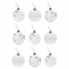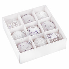 Ёлочные шары – непременный атрибут Нового года. Они будут отлично смотреться как на зеленой, так и на белой хвое. Насыщенные цвета в сочетании с отделкой разной фактуры создадут атмосферу праздника и волшебства.В комплекте 9 шаров диаметром 6 см: 3 шара серебристо-прозрачного цвета с узорами и стразами, 3 шара серебристо-прозрачного цвета с бусинами и пайетками, 3 сетчатых шара белого цвета с блёстками и пайетками, а также 9 нитей из полиэстера серебристого цвета длиной 30 см для подвешивания шаров.