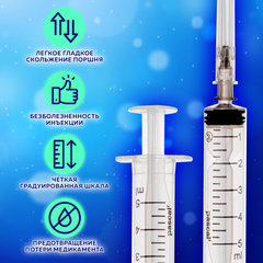 Шприц комплектуется одной надетой на шприц иглой инъекционной со стандартным срезом, с трехгранной заточкой и силиконовым покрытием для атравматического введения и снижения болезненности при проникновении в ткани. Цветовая кодировка иглы соответствует требованиям стандарта ГОСТ Р ИСО 6009. Материал канюли иглы — нержавеющая сталь. Предохранительный колпачок иглы имеет пять ребер жесткости, обеспечивающие удобство снятия, и, соответственно, дополнительную безопасность медицинского персонала при снятии колпачка с иглы и уменьшает риск контаминации иглы при снятии колпачка, а также обеспечивает экономию времени для выполнения простой медицинской манипуляции «инъекция».