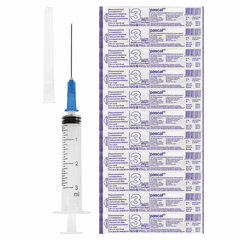 Индивидуальная стерильная блистерная упаковка с отогнутым краем — плотная медицинская бумага и прозрачная пленка (состав пленки — полиэтилен / полиамид). Упаковка вскрывается с небольшим усилием, что предотвращает самопроизвольное вскрытие, без образования бумажной бахромы. Метод стерилизации — этиленоксид (EO). Тип товара: универсальный, Комплектность: 3-х компонентный, Количество в комплекте: 100 шт., Объем шприца: 3 мл, Тип наконечника: Luer, Размер иглы: 23G, Диаметр иглы: 0.6 мм, Длина иглы: 30 мм. Код: 630497