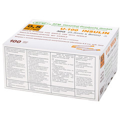 Упакован по 10 штук в ПЭ пакете. Нетоксичен, апирогенен. Метод стерилизации – этиленоксид (EO). Тип товара: инсулиновый, Комплектность: 3-х компонентный, Количество в комплекте: 10 шт., Объем шприца: 0.5 мл, Тип наконечника: интегрированная игла, Шкала: U-100, Размер иглы: 30G, Диаметр иглы: 0.3 мм, Длина иглы: 8 мм. Код: 630469
