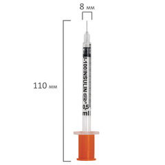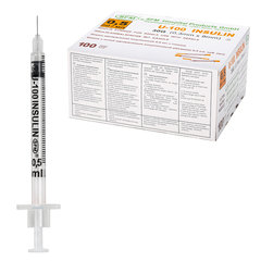 Шприц инсулиновый с интегрированной иглой состоит из трех компонентов: цилиндр, поршень и манжета. Имеет градуировку по шкале U-100, объем - 0,5 мл, размер иглы - 30G.Безболезненность инъекции обуславливается легким скольжением поршня, без трения. Удерживающее кольцо на поршне предотвращает потерю медикамента. Градуировка на шприце выполнена в единицах инсулина и позволяет легко считывать показания.
