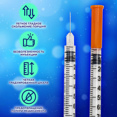 Шприц инсулиновый с интегрированной иглой состоит из трех компонентов: цилиндр, поршень и манжета. Имеет градуировку по шкале U-100, объем - 1 мл, размер иглы - 29G.Безболезненность инъекции обуславливается легким скольжением поршня, без трения. Удерживающее кольцо на поршне предотвращает потерю медикамента. Градуировка на шприце выполнена в единицах инсулина и позволяет легко считывать показания.