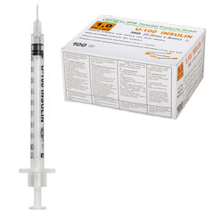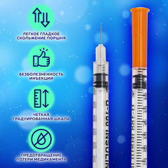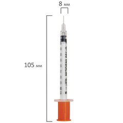 Шприц инсулиновый с интегрированной иглой состоит из трех компонентов: цилиндр, поршень и манжета. Имеет градуировку по шкале U-100, объем - 1 мл, размер иглы - 30G.Безболезненность инъекции обуславливается легким скольжением поршня, без трения. Удерживающее кольцо на поршне предотвращает потерю медикамента. Градуировка на шприце выполнена в единицах инсулина и позволяет легко считывать показания.