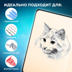 Благодаря компактному формату его можно носить с собой, а жесткая обложка станет верным подспорьем для рисования на весу. Дополнением является закладка-ляссе, с помощью которой при необходимости можно быстро открыть скетчбук на нужной странице, и держатель для письменных принадлежностей. Эластичная резинка надежно сбережет листы от замятия и случайного раскрытия. На задней обложке расположен карман для мелочей
