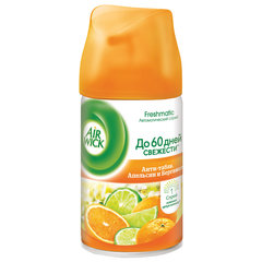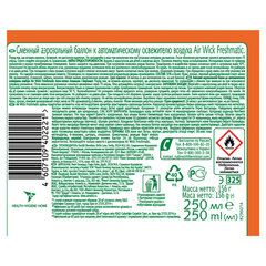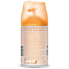 Сменный баллон AIRWICK предназначен для ароматизации воздуха и удаления неприятных запахов в помещениях (офисе, ресторане, туалете, помещении для курения). Содержит натуральные масла и экстракты.Наслаждайтесь изысканным ароматом бодрящего апельсина и бергамота вместе с аэрозольным освежителем AIRWICK Freshmatic "Бодрящий апельсин и бергамот". Сменный баллон освежителя воздуха поможет поддерживать в доме приятный и свежий аромат. Средство прекрасно борется с любыми нежелательными запахами. Его можно устанавливать на кухне, в ванной комнате или туалете. Аэрозоль не оставляет разводов и других следов на занавесках, мебели и других предметах.