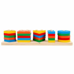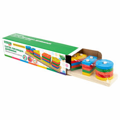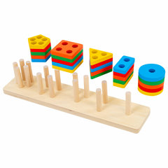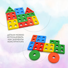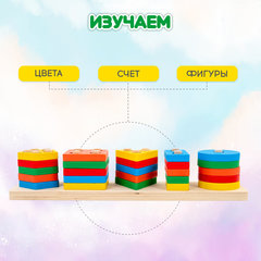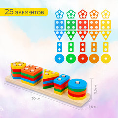Состав развивающего сортера-пирамидки: 1. Доска размером 30х6,8 см. 2. Геометрические фигурки "Круг" - 5 шт. 3. Геометрические фигурки "Прямоугольник" - 5 шт. 4. Геометрические фигурки "Треугольник" - 5 шт. 5. Геометрические фигурки "Квадрат" - 5 шт. 6. Геометрические фигурки "Пятиугольник" - 5 шт.