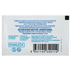 Срок годности: 5 лет. Назначение: для антисептической обработки рук, для обеззараживания инструментов, для обеззараживания поверхностей, для/после инъекций, Размер: 135х185 мм, Количество в упаковке: 50 шт., Вид пропитки: 70% этиловый спирт, Материал: нетканый материал, Упаковка: пакет зип-лок. Код: 630866