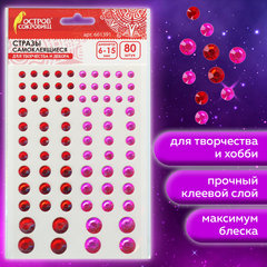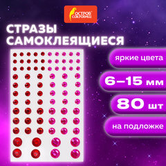 Стразы самоклеящиеся "Круглые", 6-15 мм, 80 шт., розовые/красные, на подложке, ОСТРОВ СОКРОВИЩ, 661391