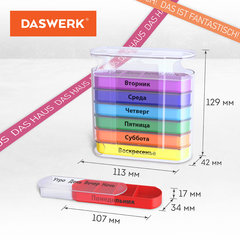 Таблетница DASWERK предназначена для надежного хранения лекарств, витаминов и пищевых добавок. Контейнер из легкого и прочного пластика гарантирует удобство и безопасность в использовании.Таблетница представляет собой 7 ежедневных контейнеров с 4 отделениями каждый, расположенных в удобном органайзере, который позволяет упорядочить прием лекарств по дням, переставляя контейнер с нужным днём наверх.