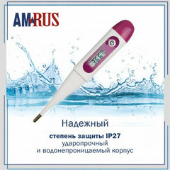 Термометр медицинский цифровой AMDT-16 AMRUS с защитным колпачком. Термометр оснащен большим дисплеем с крупными легко читаемыми символами и стеклом специальной формы для удобства считывания показаний.Корпус имеет степень защиты IP 27 – ударопрочный и водонепроницаемый. Термометр характеризуется высоким быстродействием и точностью. Кнопка включения/выключения находится корпусе термометра.