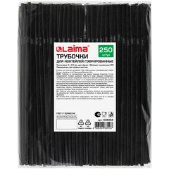 Трубочки для коктейлей гофрированные, пластиковые 5 х 210 мм, черные КОМПЛЕКТ 250 штук, LAIMA, 608358