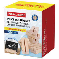 Держатели для ценников BRAUBERG предназначены для размещения меловых табличек, ценников, фото, нумерации столов и рекламной информации. Идеальны для использования в магазинах, кафе, кондитерских, барах и других заведениях.Держатели для ценников изготовлены из натуральной сосны и покрыты лаком на водной основе, обеспечивающим долговечность товара. Размер держателя составляет 70x30x20 мм, ширина пропила – 3 мм.